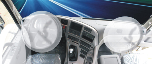 在正駕駛位的氣囊裝在方向盤的中間位置,副駕駛位置的安全氣囊裝在正前方的平臺(tái)內(nèi)部,在意外發(fā)生的瞬間可以有效的保護(hù)駕駛員和副駕駛位乘員的頭部和胸部,因?yàn)檎姘l(fā)生的猛烈碰撞會(huì)導(dǎo)致車輛前方大幅度的變形,而車內(nèi)乘員會(huì)隨著這股猛烈的慣性向前沖造成跟車內(nèi)構(gòu)件的相互撞擊,另外車內(nèi)正駕駛位置的安全氣囊可以有效的防止在發(fā)生碰撞時(shí)方向盤頂?shù)今{駛者的胸部,避免致命的傷害